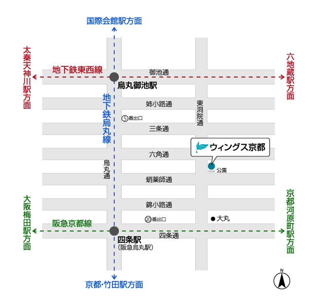 地下鉄烏丸線四条駅(阪急烏丸駅)20番出口から四条通沿いに東(左)に進み、一筋目の角を左折、東洞院通をまっすぐ進み二筋目の公園を越えると右手にウィングス京都の入口があります。