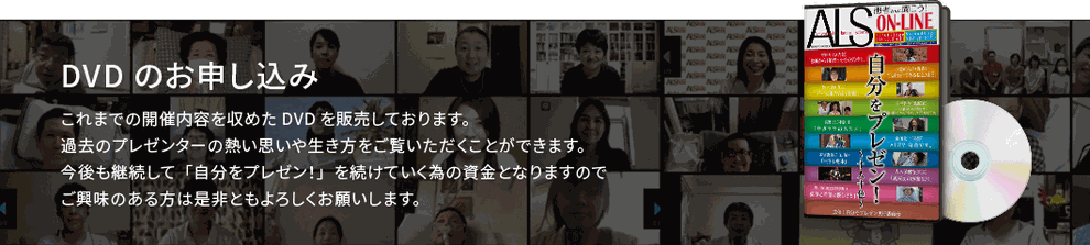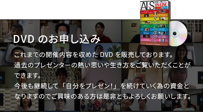 「自分をプレゼン!」では、プレゼンターがそれぞれの思いや生き方について、真正面からプレゼンテーションを行います。病気を告知されて間もない方や、呼吸器を付けられた方、支援者やボランティアの方々と「横のつながり」を作ると共に、まだ知らない様々な「選択肢」を知る事ができるイベントとして、ぜひご活用いただければ幸いです。